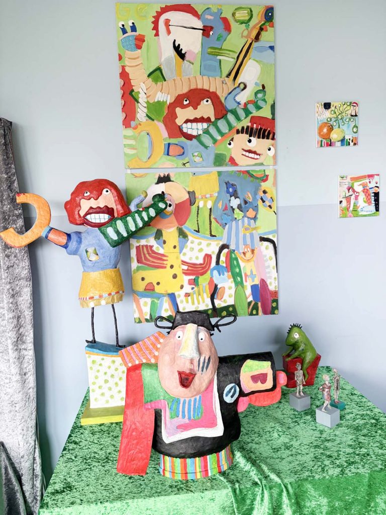 Danach erfuhren die neugierigen Ausstellungsbesucher, wie all meine Figuren entstanden sind – nämlich, dass sie einen Umweg über die Bilder nehmen, die ich male. Vor vielen Jahren wurde es einem Wesen in meinen Gemälden zu langweilig und es bat mich, es herauszuholen. Gesagt getan, seitdem habe ich ziemlich viele von diesen seltsamen Gesellen befreit. Etliche davon leben heute in meinem Keller und ich habe den Verdacht, dass diese dort nachts, wenn ich schlafe, Unsinn treiben und ihren Spaß haben…